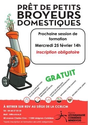 đ Le 25 fĂ©vrier prochain aura lieu une nouvelle formation pour les personnes intĂ©ressĂ©es par un prĂȘt de broyeur individuel. Ces formations sont obligatoires si vous voulez bĂ©nĂ©ficier d'un prĂȘt de broyeur.