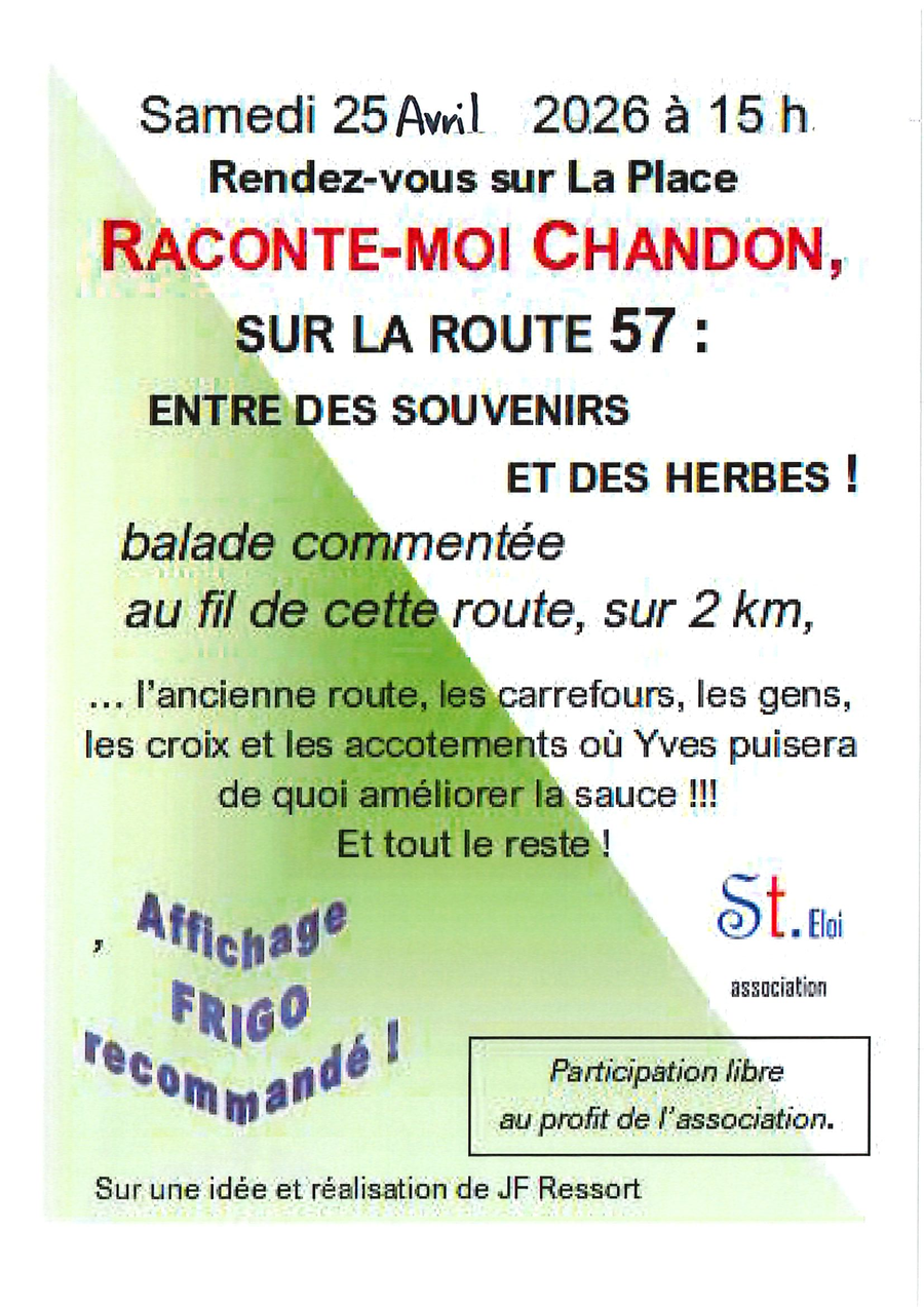 Depuis 2013, l'association Saint-Eloi publie un nouveau numéro de recueil de mémoire de Chandon, Histoire, histoires...Agrémenté d'anecdotes, de témoignages et d'illustrations compilés avec passion par le rédacteur en chef Jean-Francis Ressort. Ce bulletin permet aux lecteurs de découvrir ou redécouvrir, le passé ancien et plus récent de la commune, à travers des articles qui font la part belle au patrimoine culturel et historique.