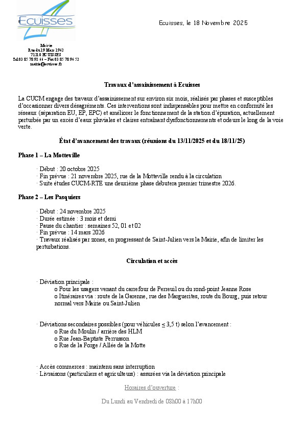 Dans le cadre de travaux sur le réseau d’assainissement à Ecuisses, l’entreprise SNTPAM va fermer la RD 974 à partir du 3 novembre 2025.