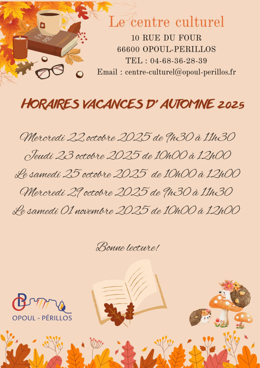 Nous vous informons que la bibliothèque sera ouverte durant les vacances d'automne 2025.