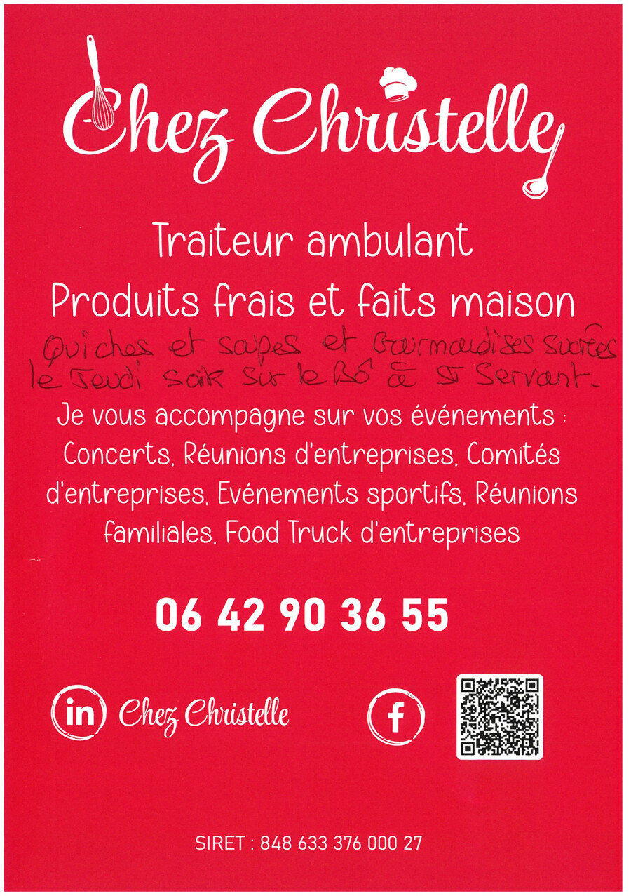 Plus d'informations : 06.42.90.36.55 ou Facebook : https://www.facebook.com/people/Chez-Christelle/61578212616717/