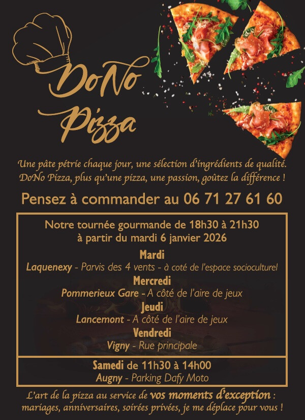 A partir du vendredi 9 janvier, notre commune accueille avec plaisir Natacha et son camion "DoNo Pizza" de 18h30 à 21h30 au niveau du 32 rue principale.