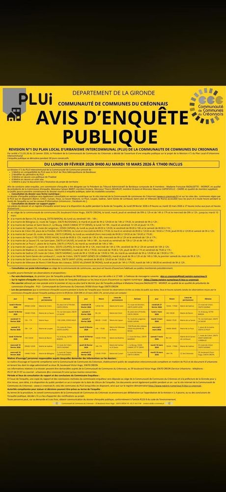Par arrêté n°11.01.26 du 22 Janvier 2026, le Président de la Communauté de Communes du Créonnais a décidé de l’ouverture d’une enquête publique sur le projet de la Révision n°1 du Plan Local d’Urbanisme Intercommunal.