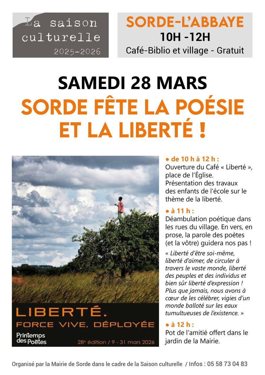Le thème est la LIBERTÉ, alors nous vous donnons rendez-vous au café-biblio, 4 place de l’Église, rebaptisé le « Café Liberté ». Autour d’une boisson chaude ou fraîche, nous découvrirons le travail des pitchouns de l’école de Sorde sur la liberté.