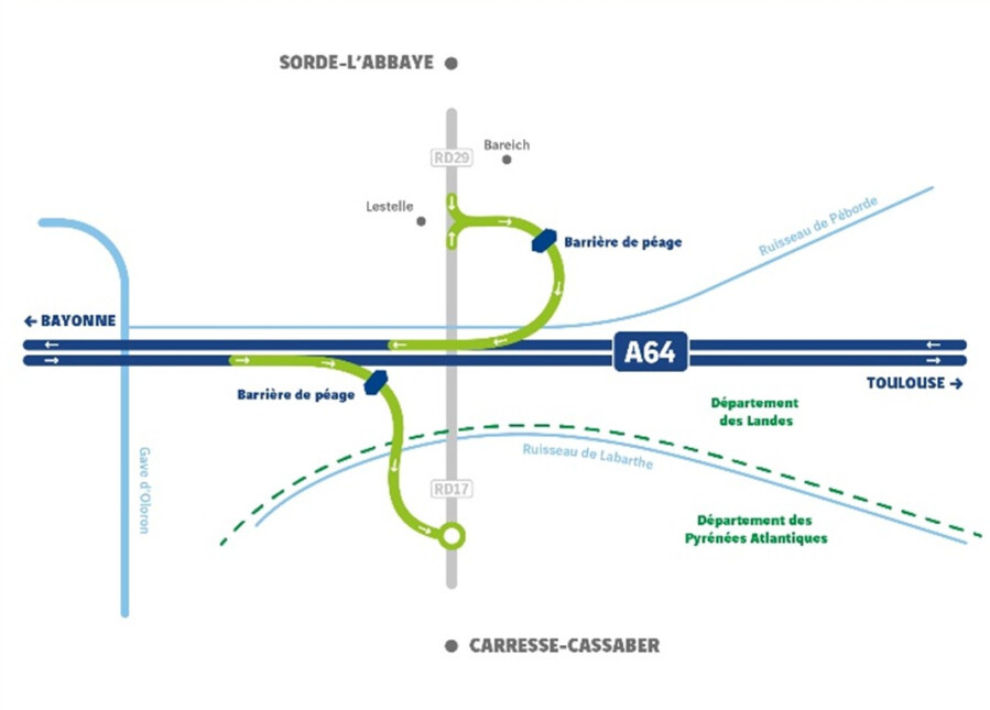 Le projet de demi-échangeur consiste à créer 2 bretelles pour sortir ou entrer sur l’autoroute A64 depuis et vers Bayonne.