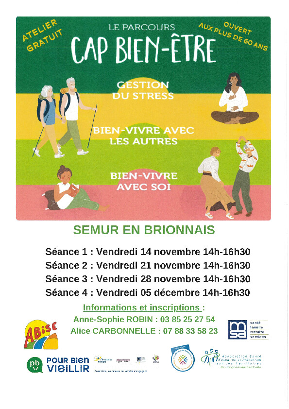 L'atelier CAP BIEN ETRE propose 4 séances hebdomadaires, durant lesquelles une animatrice formée accompagne les participants autour du bien-être, de gestion du stress et des émotions (théorie, échanges, mise en pratique, astuces, ...).