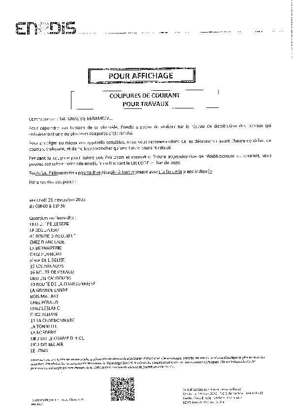 Enedis vous informe d'une coupure de courant pour travaux concernant la commune de SALIGNAC DE MIRAMBEAU.