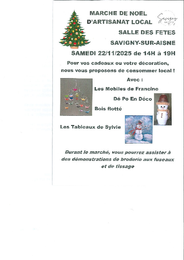 L'Association Savigny-Loisirs organise un marché de Noël le samedi 22 novembre de 14h à 19h à la salle polyvalente