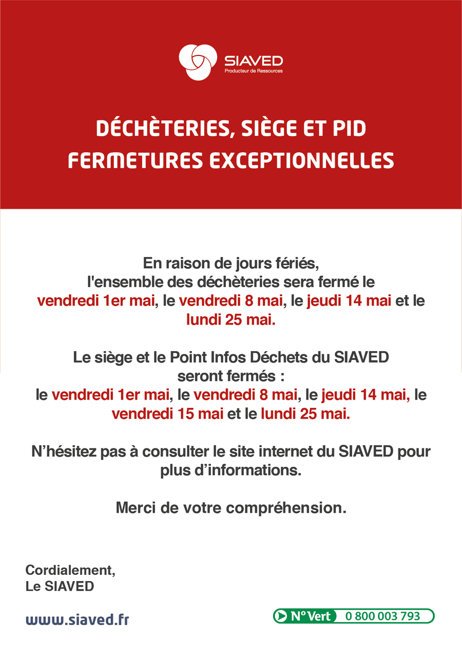Le SIAVED informe les usagers que l’ensemble de ses déchèteries sera fermé les jours fériés suivants: