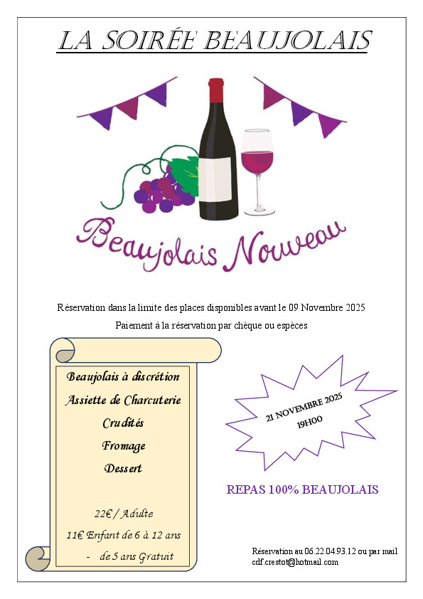 N'oubliez pas de réserver votre soirée beaujolais organisée par le comité des fêtes, le vendredi 21 novembre.