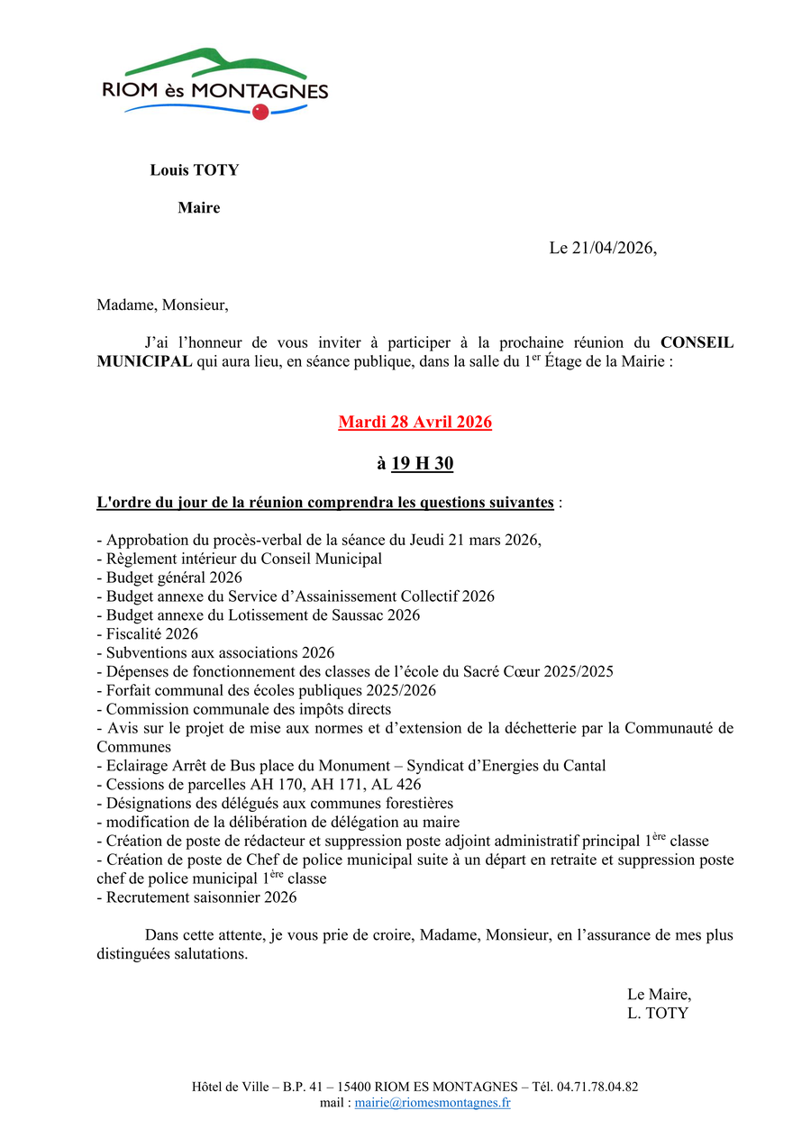 La prochaine réunion du Conseil Municipal aura lieu Mardi 28 avril 2026 à 19h30 dans la salle d'honneur de la mairie.