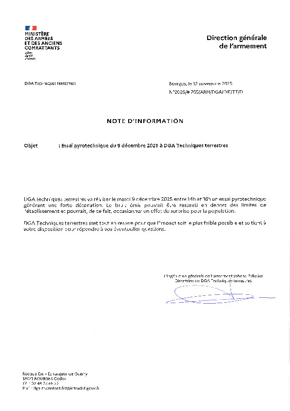 Selon l'information de DGA Techniques Terrestres à Bourges (Polygone et communes limitrophes),