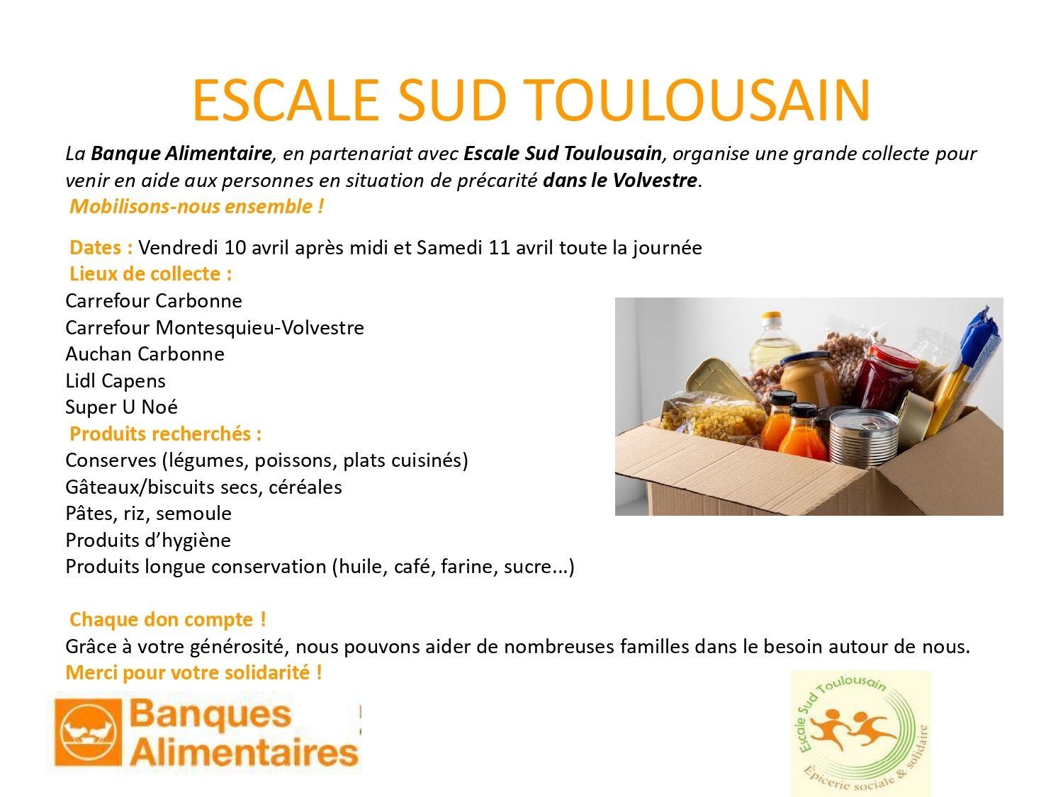 Nos bénévoles seront présents vendredi après midi et samedi toute la journée aux entrées des grandes surfaces locales pour recevoir vos dons qui seront redistribués aux habitants du Volvestre en difficulté.