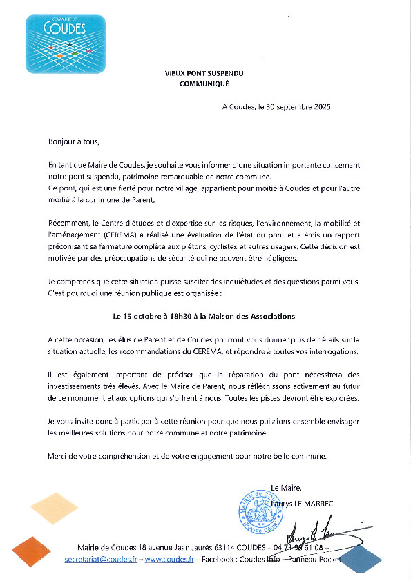 Permanence Mutuelle de village Précocia en mairie le mardi 04 novembre de 9h00 à 12h00, sur rdv auprès du secrétariat de mairie : 04 73 96 61 08 ou secretariat@coudes.fr