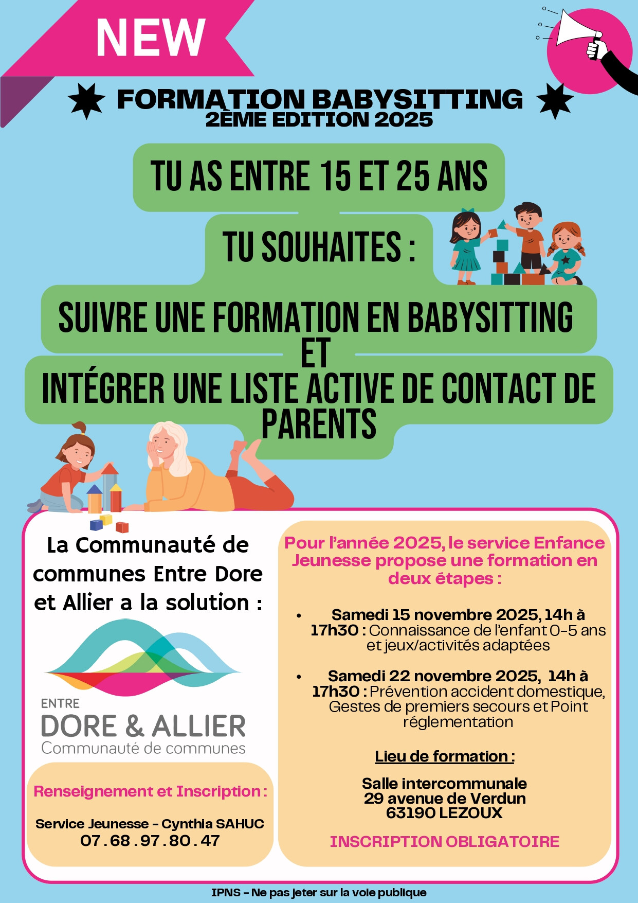 Le service Enfance Jeunesse de la Communauté de communes Entre Dore et Allier propose la 2ᵉ édition de la formation Baby-sitting, destinée aux jeunes du territoire âgés de 15 à 25 ans.