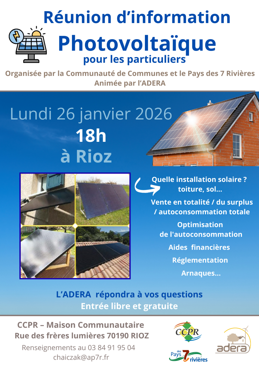 Une réunion d’information sur le photovoltaïque pour les particuliers aura lieu le lundi 26 janvier 2026 à 18H à la maison communautaire à RIOZ. Le but n'est absolument pas de vendre quoi que ce soit mais d'informer.