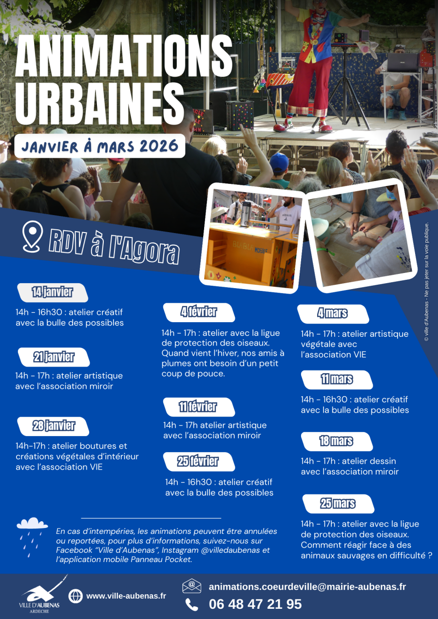 ⛈️⚡❄️ En cas d’intempéries, les animations peuvent être annulées ou reportées… suivez l’actualité des animations urbaines sur Facebook, Instagram @villedaubenas et l’application mobile Panneau Pocket.