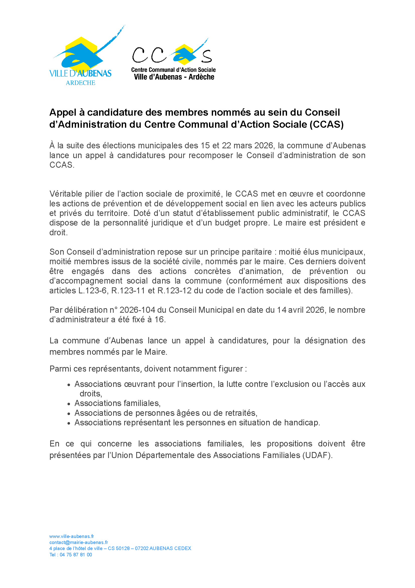 👥 À la suite des élections municipales 2026, la commune d’Aubenas lance un appel à candidatures pour recomposer le Conseil d’administration de son CCAS.