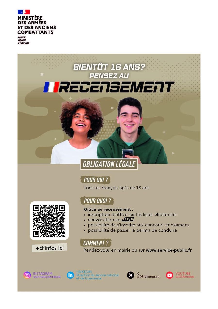 🟢 Tous les citoyens français âgés de 16 à 25 ans doivent obligatoirement effectuer leur recensement citoyen, en ligne ou en mairie. Il doit être fait dans les 3 mois qui suivent le 16e anniversaire.