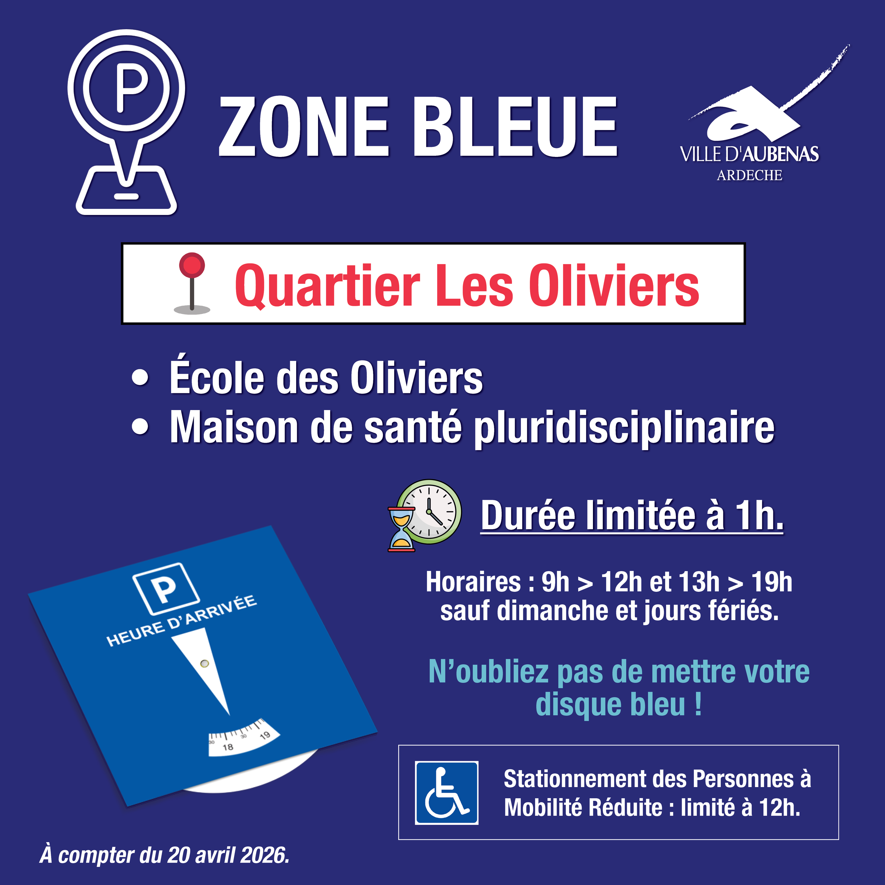 Nouveauté dès le 20 avril 2026 : zone bleue limitée à 1h pour les parkings "Maison de santé" et "École des Oliviers".
