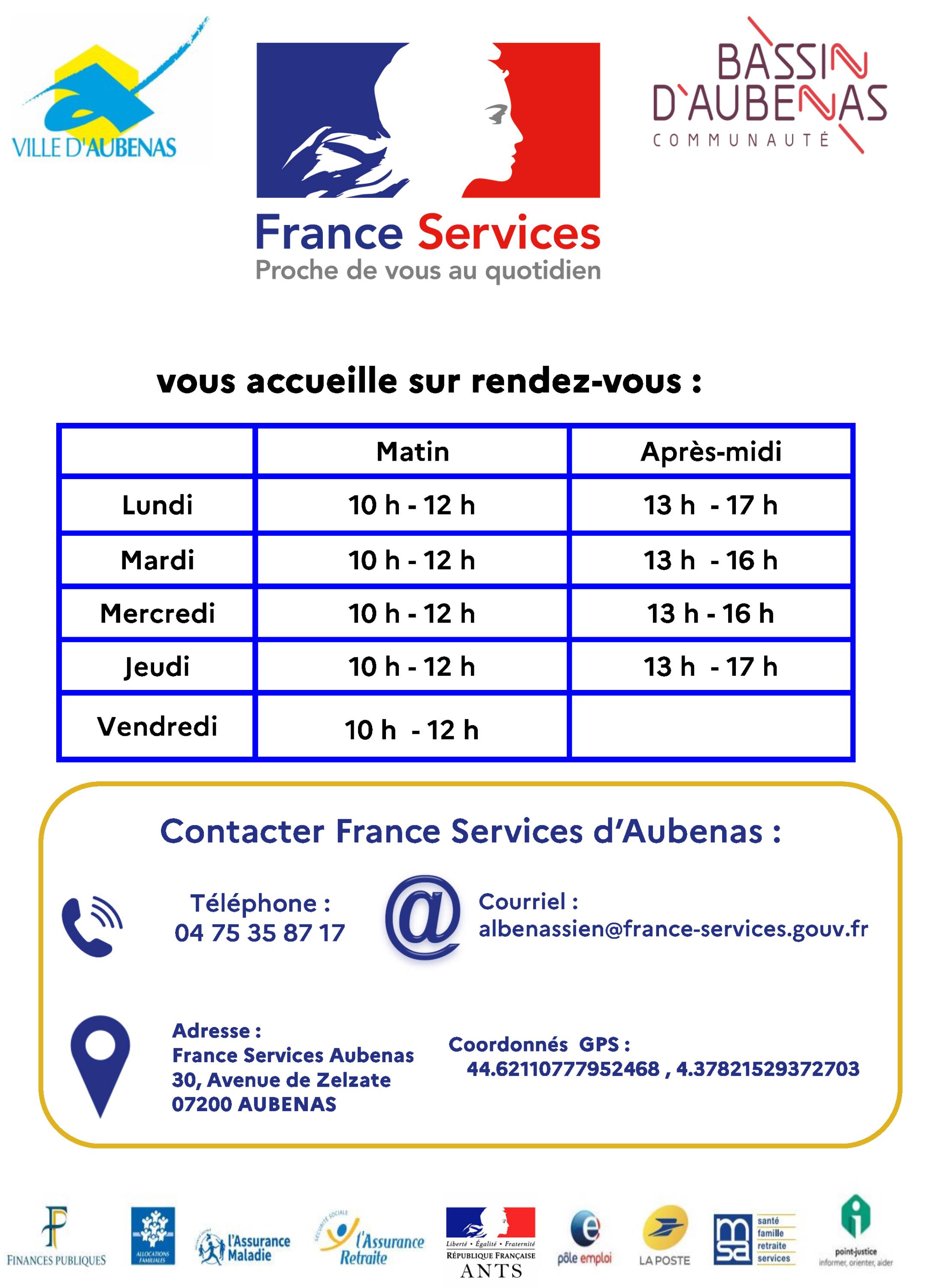 - L’accueil France services (CCBA) : 04 75 35 87 17 / albenassien@france-services.gouv.fr