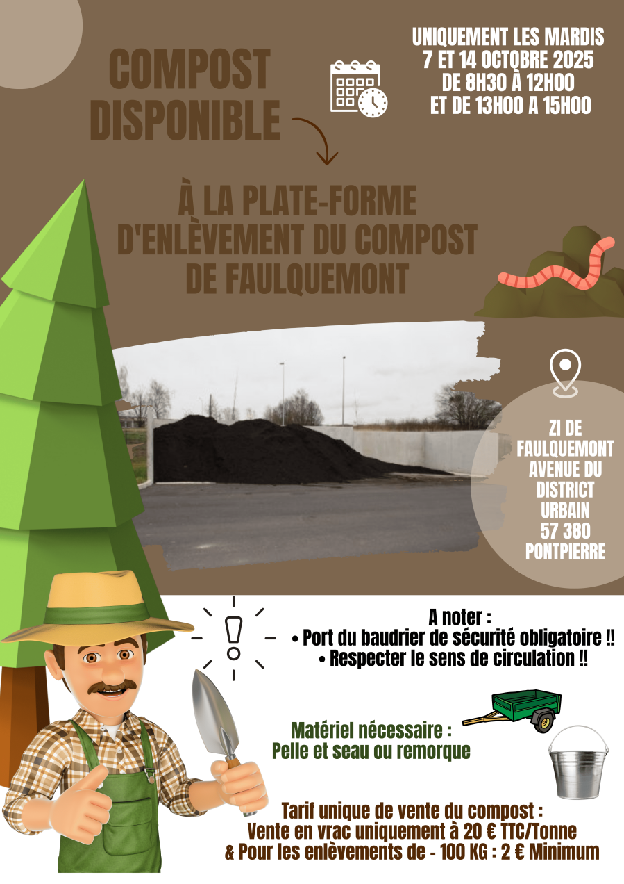 Nous avons le plaisir de vous informer que la plate-forme d’enlèvement du compost de Faulquemont rouvrira provisoirement pour 2 journées dédiées :