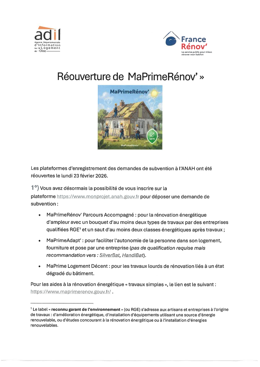Pour les personnes qui seraient intéressées les plateformes d'enregistrement des demandes de subvention à L'ANAH ont été réouvertes le lundi 23 Février 2026.