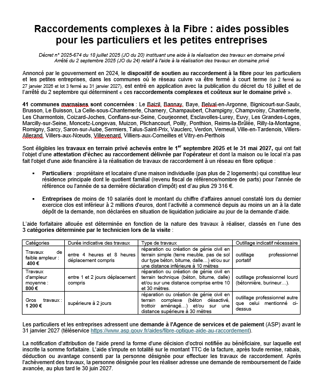 41 communes marnaises sont concernées par la possibilité d’obtenir un soutien financier pour les travaux complexes et coûteux sur le domaine privé, nécessaires au raccordement à la fibre optique.