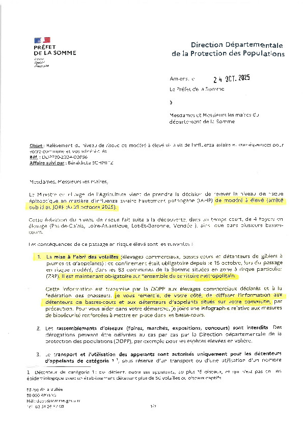 concernant l'influenza aviaire et ses conséquences pour votre commune et