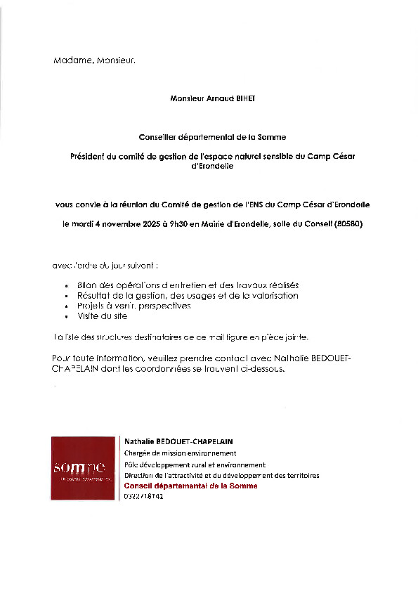 Monsieur Arnaud BIHET Conseiller départemental de la Somme Président du comité de gestion de l'espace naturel sensible du Camp César d’Erondelle nous convie à la réunion du Comité de gestion de l’ENS du Camp César d’Erondelle le mardi 4 novembre 2025 à 9h30 en Mairie d’Erondelle, salle du Conseil