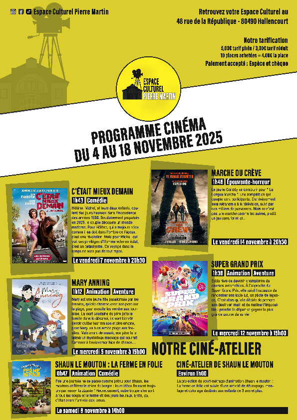 La programmation Cinéma de l'Espace Culturel Pierre Martin à Hallencourt des deux premières semaines de novembre est disponible !