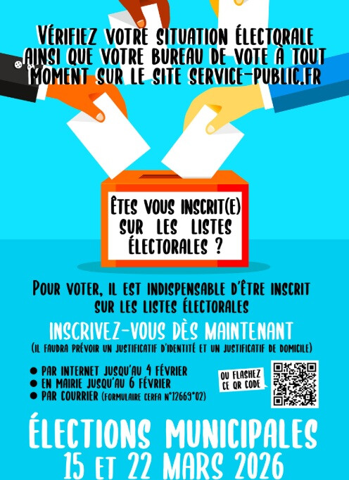 Pour les élections municipales 2026, il sera possible de s'inscrire sur les listes électorales en ligne jusqu'au 4 février 2026 et en mairie jusqu'au 06 février 2026.
