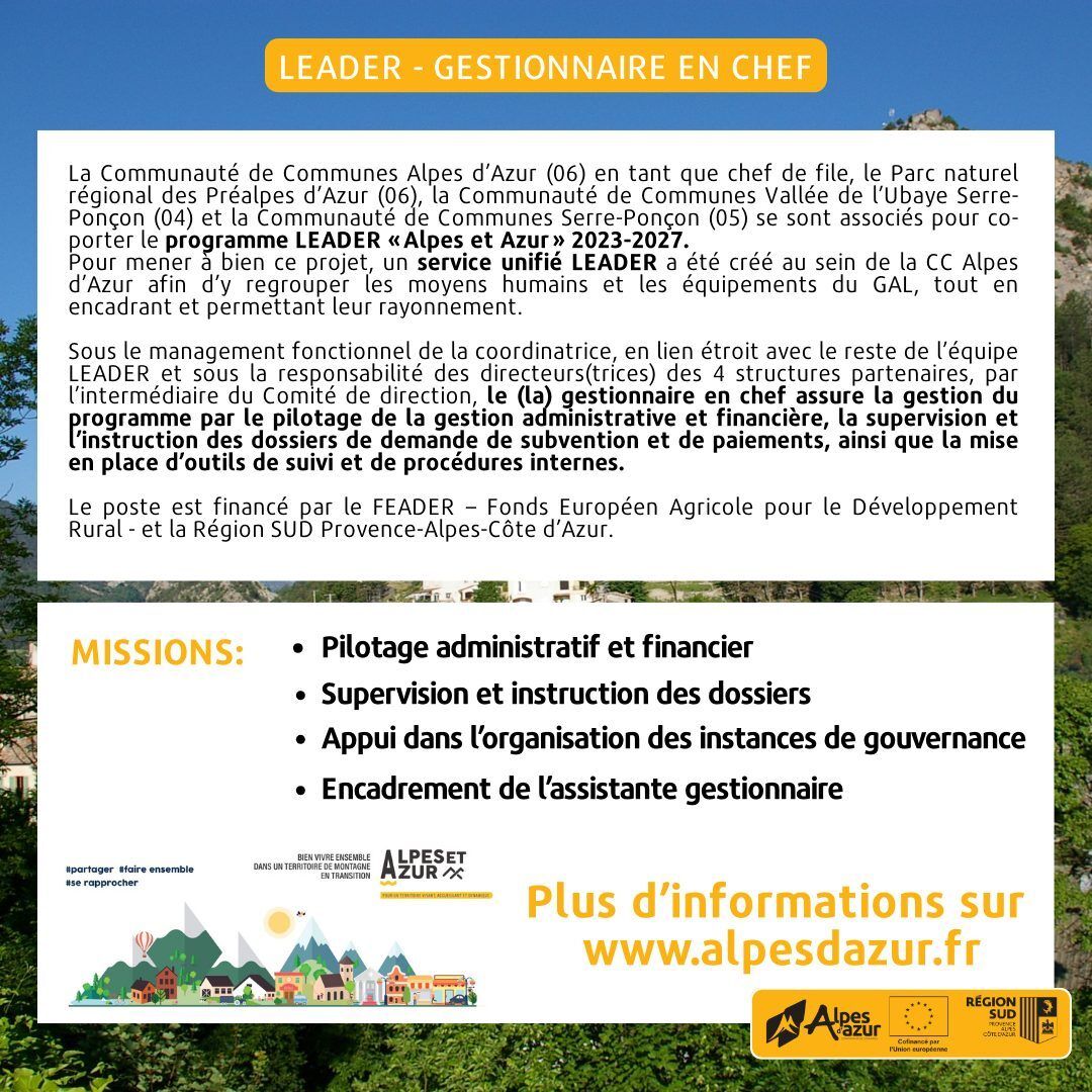 la Communauté de Communes Alpes d’Azur relance le recrutement du gestionnaire en chef du programme LEADER 2023-2027.