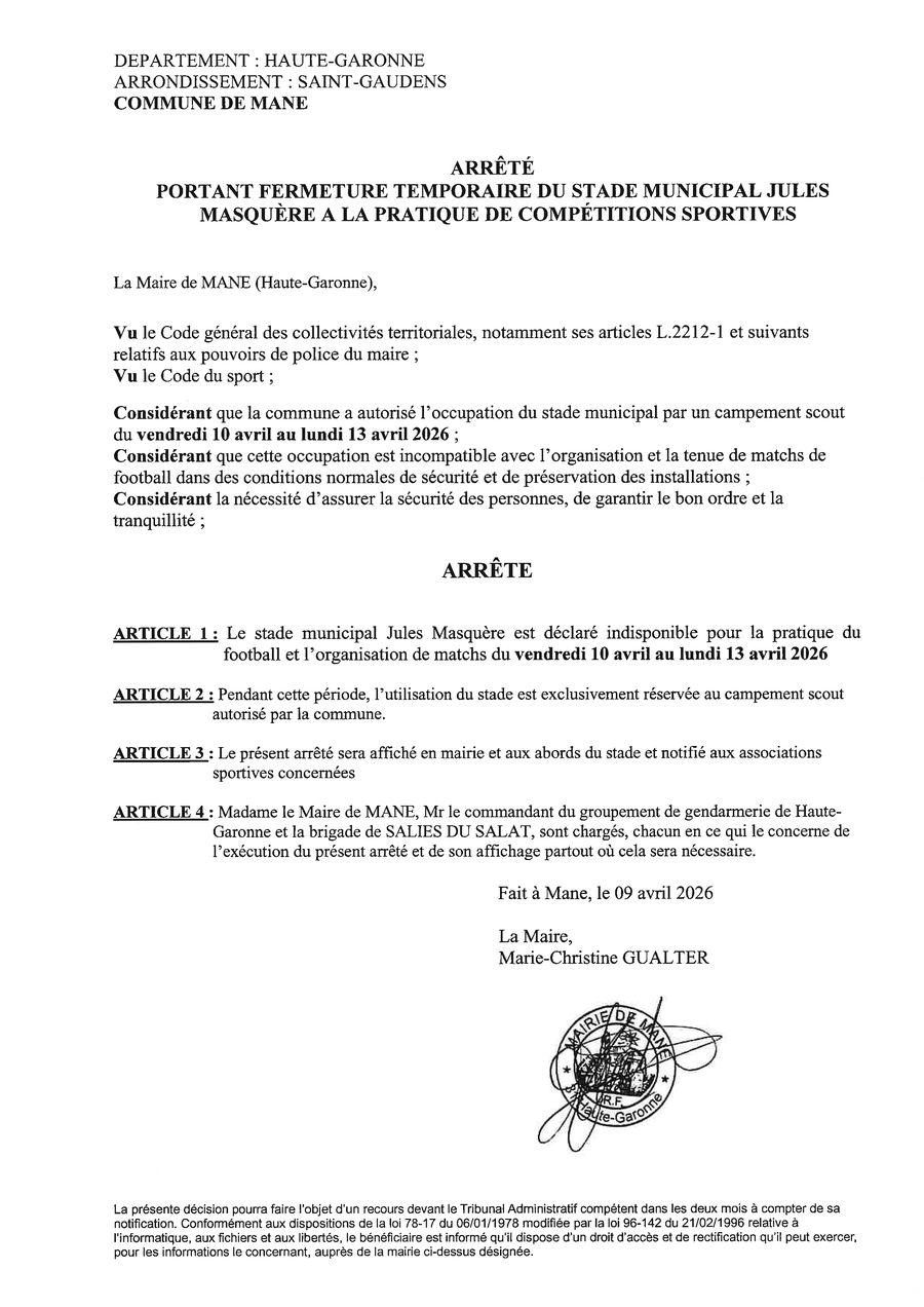 Arrêtés portant fermeture du stade et du complexe touristique de la Justale du 10/04 au 13/04/2026