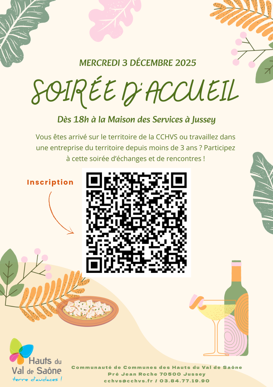 La CCHVS (Communauté de Communes des Hauts du Val de Saône) organise le mercredi 3 décembre 2025 à la maison des services une soirée d’accueil pour les personnes qui habitent sur le territoire ou travaillent dans une entreprise du territoire depuis moins de 3 ans.