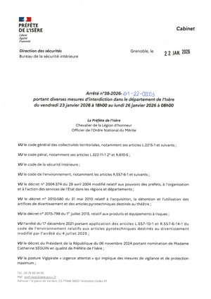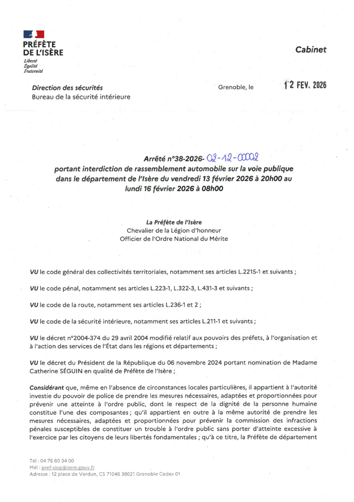 - un arrêté de Madame la Préfète de l’Isère portant interdiction de rassemblement automobile sur la voie publique dans le département de l’Isère du vendredi 23 janvier 2026 à 18h au lundi 26 janvier 2026 à 8h00