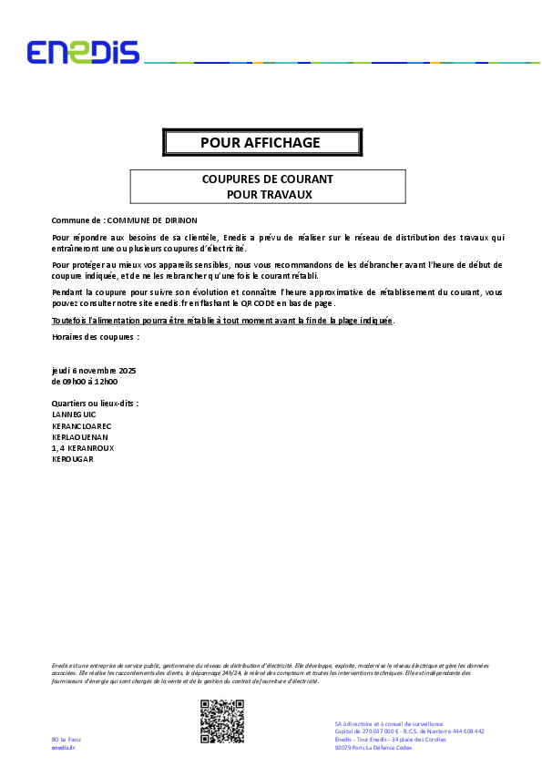 Pour répondre aux besoins de sa clientèle, Enedis a prévu de réaliser sur le réseau de distribution des travaux qui entraîneront une ou plusieurs coupures d’électricité.