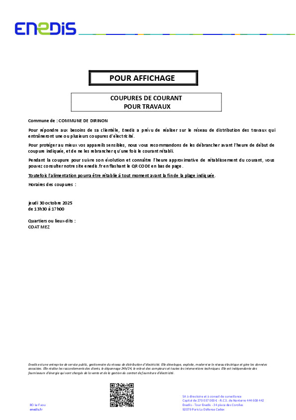 Pour suivre l'Ă©volution de la coupure et connaĂźtre l'heure approximative de rĂ©tablissement du courant, vous pouvez consulter notre site enedis.fr/panne-et-interruption. Toutefois l'alimentation pourra ĂȘtre rĂ©tablie Ă tout moment avant la fin de la plage indiquĂ©e.