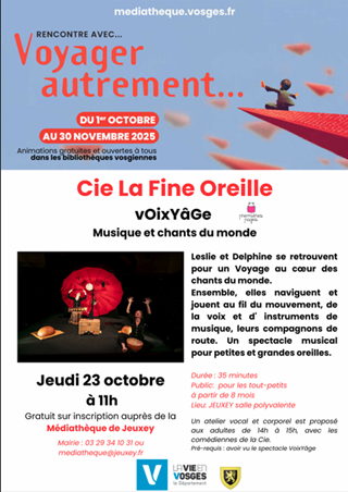La Médiathèque de Jeuxey vous donne rendez-vous pour un spectacle musical de la Cie La Fine Oreille : “VoixYâGe”,