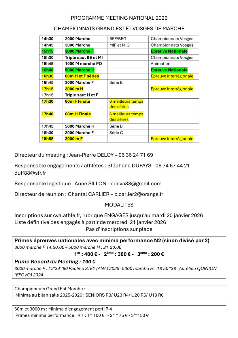 Notons notamment le 3000 et le 5000 marche en épreuves nationales (et championnats Grand Est)