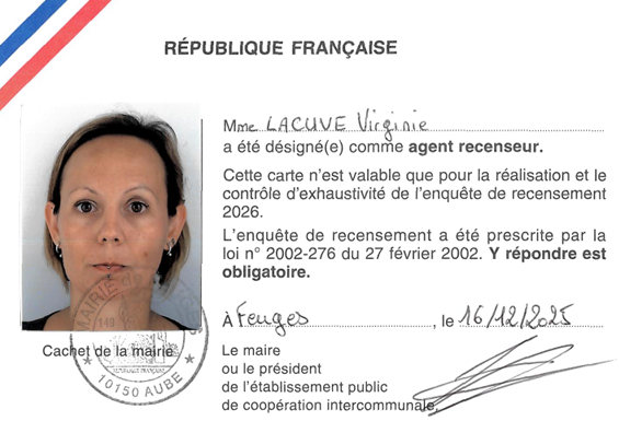 Merci de réserver votre meilleur accueil à Virginie LACUVE, qui circulera prochainement dans la commune dans le cadre du recensement de la population.