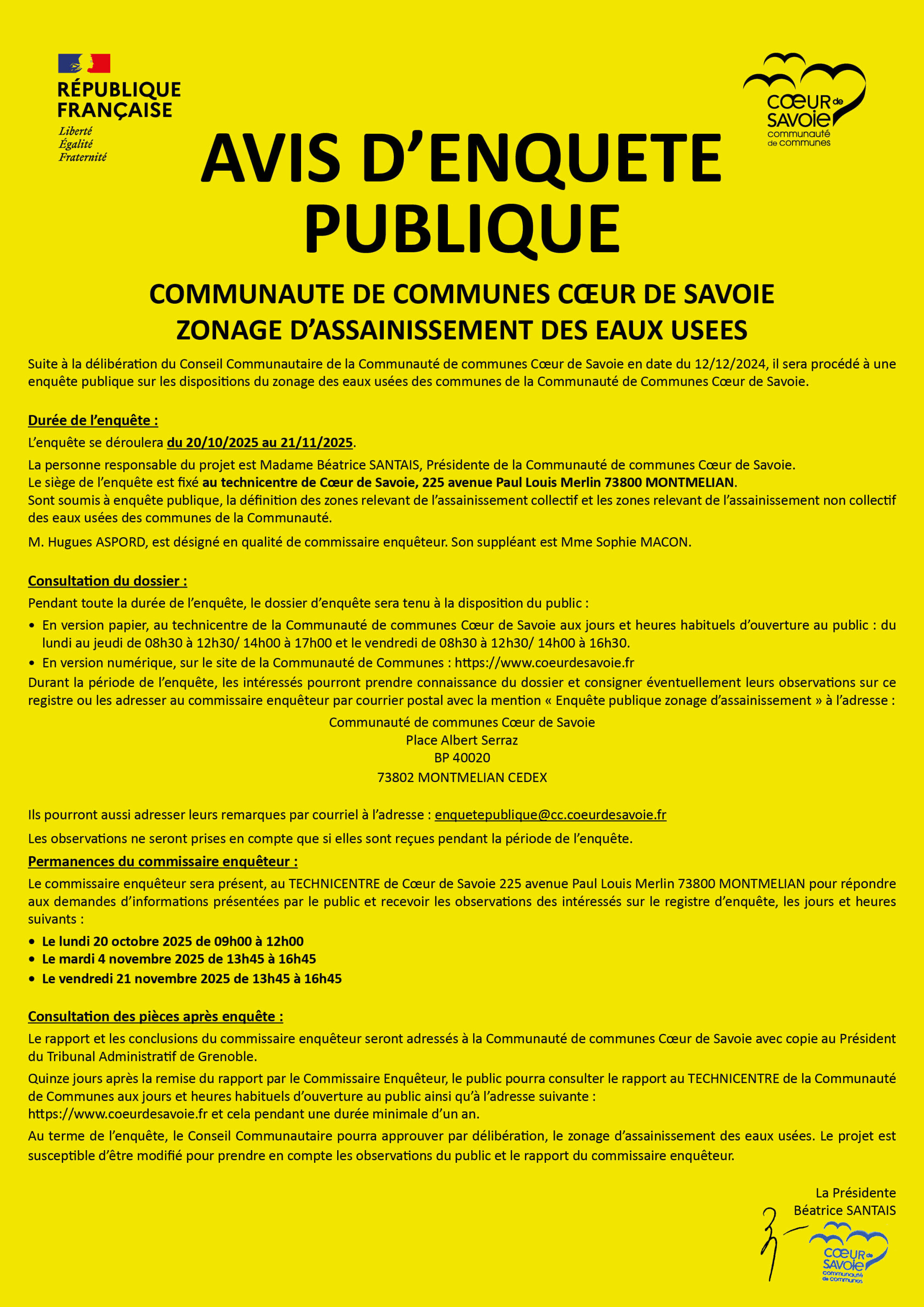 Suite à la délibération du Conseil Communautaire de la Communauté de communes Cœur de Savoie en date du 12/12/2024, il sera procédé à une enquête publique sur les dispositions du zonage des eaux usées des communes de la Communauté de Communes Cœur de Savoie.