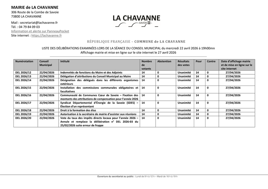 - soit le secrétariat de la mairie de LA CHAVANNE au 04 79 84 09 03,