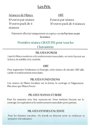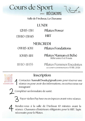 Cours de HIIT, Pilates, Pilates pour femme enceinte et nouvelles mamans assurés par Coach Hannah Wade durant la période scolaire dans la salle d’Arclusaz.