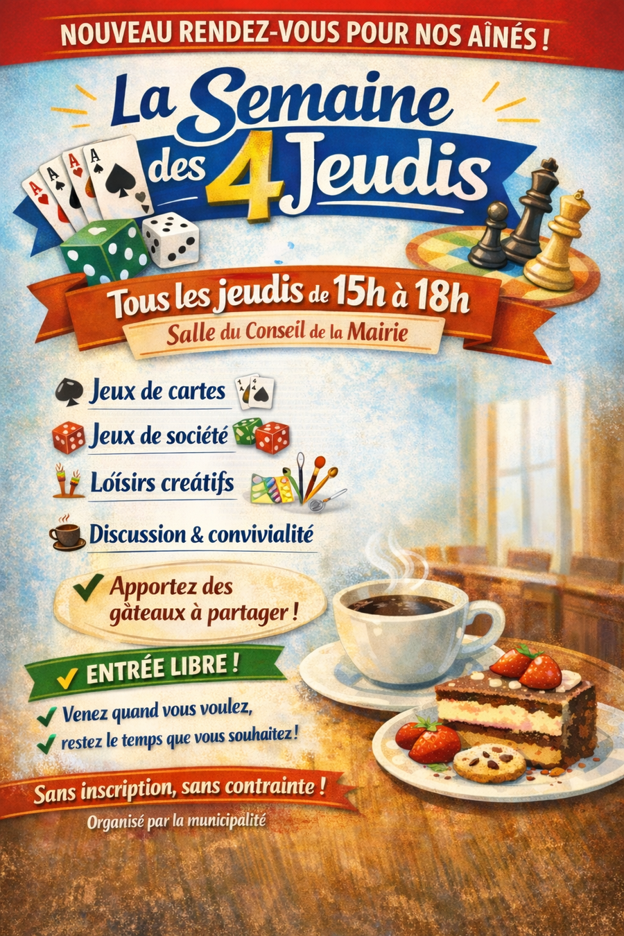 Chaque jeudi de 15h à 18h (hors jours fériés), les aînés pourront se retrouver dans la salle du conseil de la mairie.