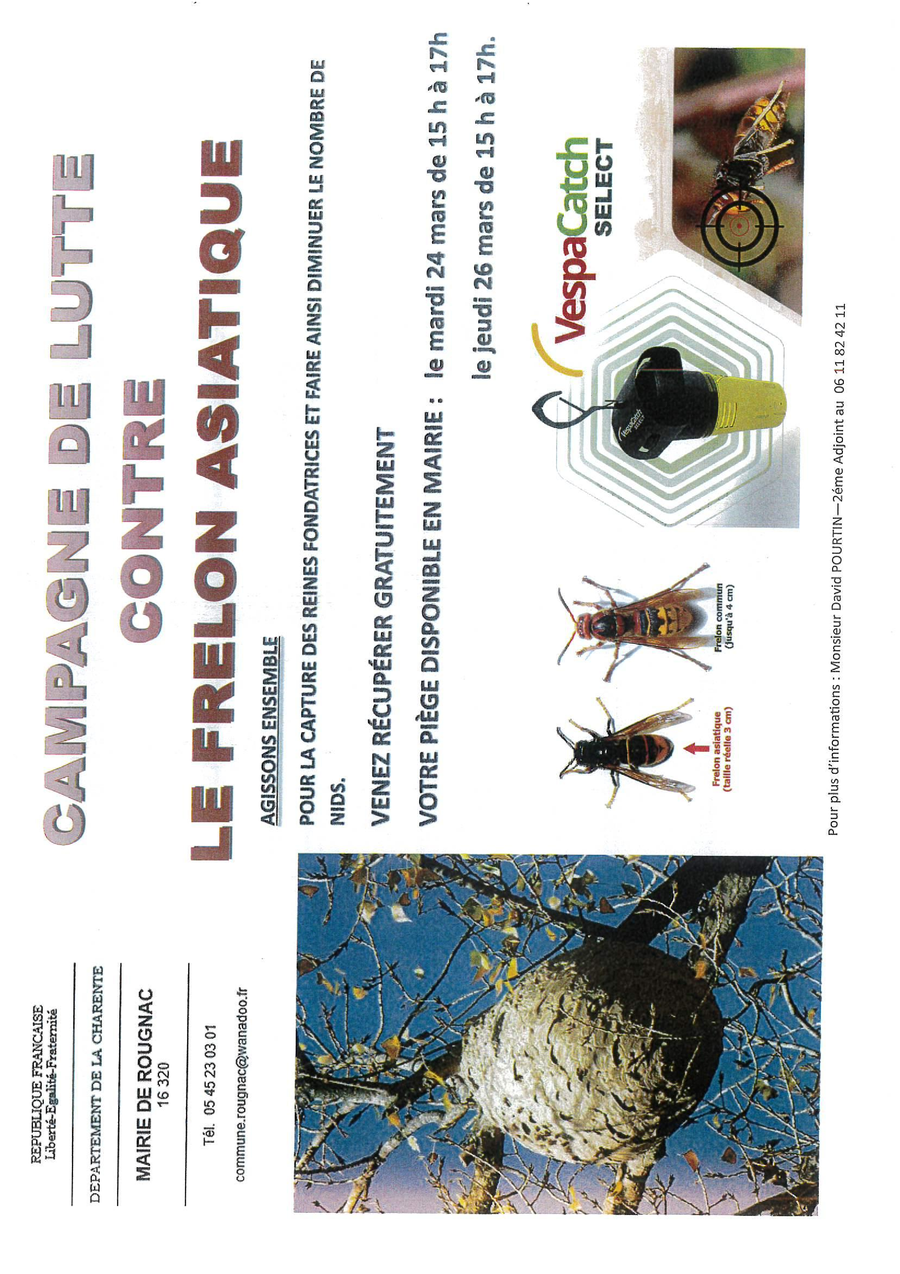 Le Conseil municipal de Rougnac, en date du 06/05/2024, a décidé de prendre en charge l'intégralité de la facture pour l'intervention d'un professionnel chez un habitant de la commune, pour la destruction des nids de frelons asiatiques.