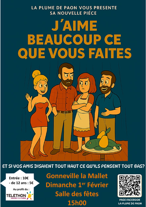 “J'aime beaucoup ce que vous faites”, pièce de théâtre de Carole GREEP qui sera prochainement jouée à Criquetot-l'Esneval, Montivilliers, Valmont, Saint-Pierre-en-Port par la troupe de théâtre “Plume de Paon” créée en 1996.