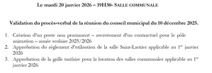 Ce mardi 20 janvier retrouvez le Conseil Municipal en salle communale autour de cet ordre du jour :