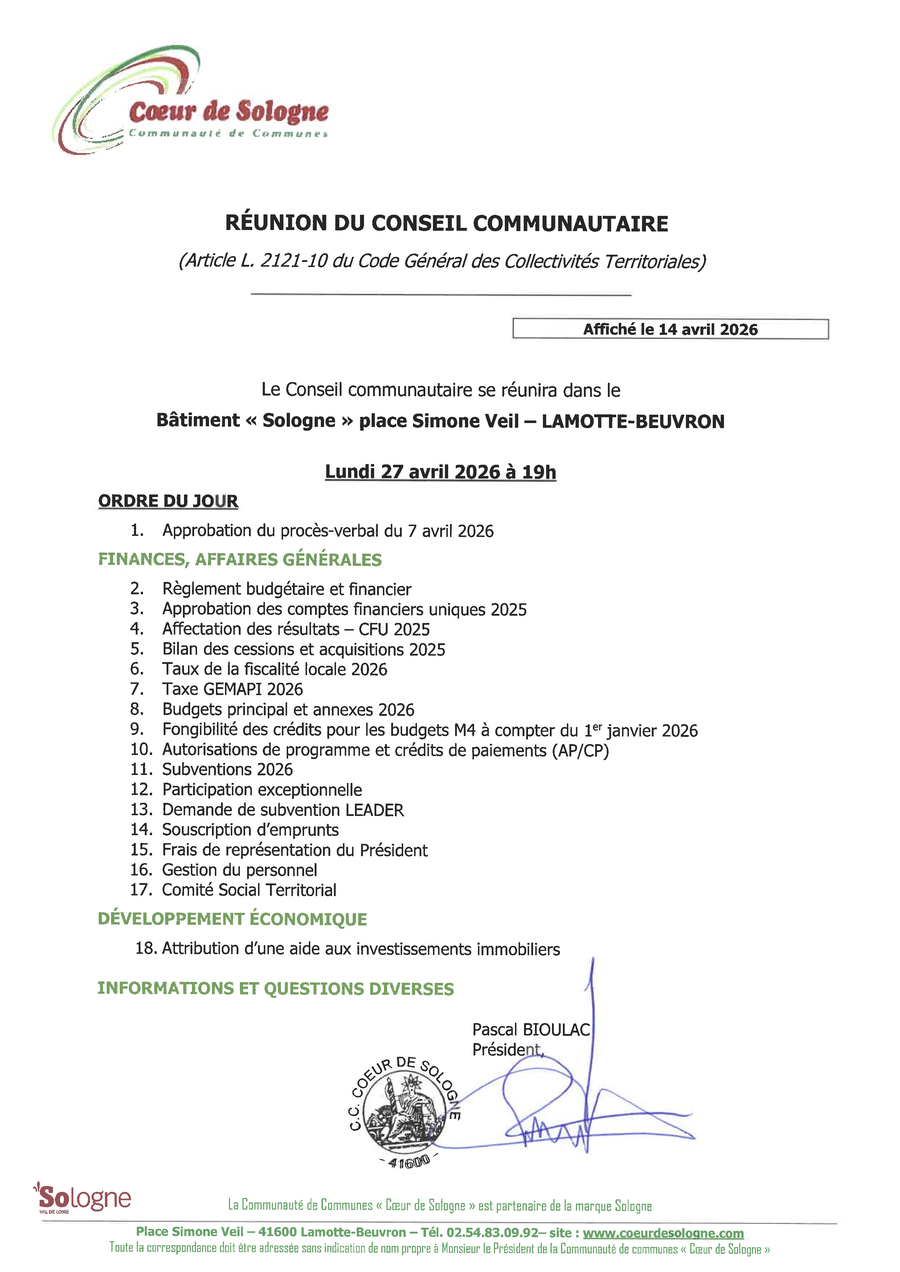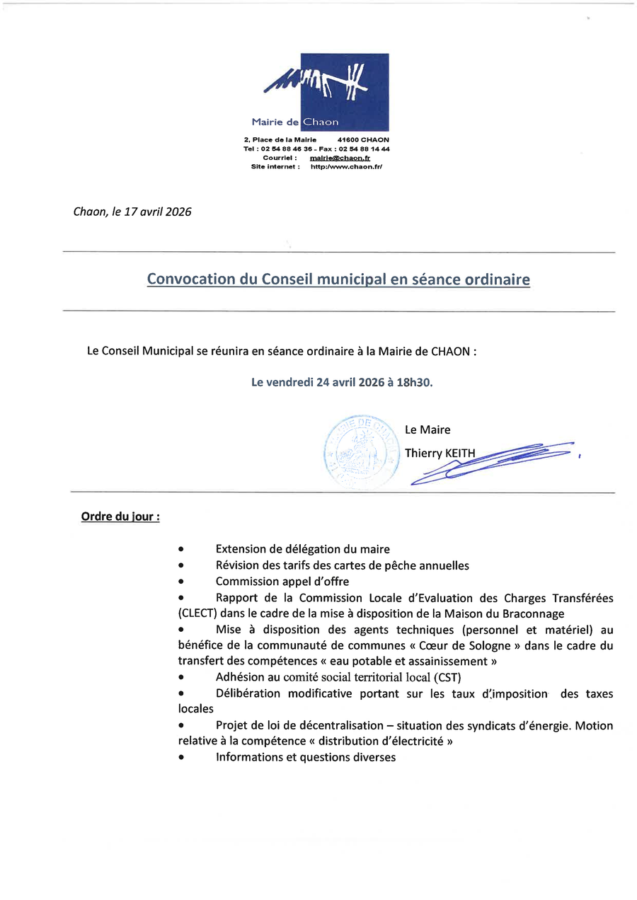 Le Conseil Municipal se réunira en séance ordinaire à la Mairie de CHAON :