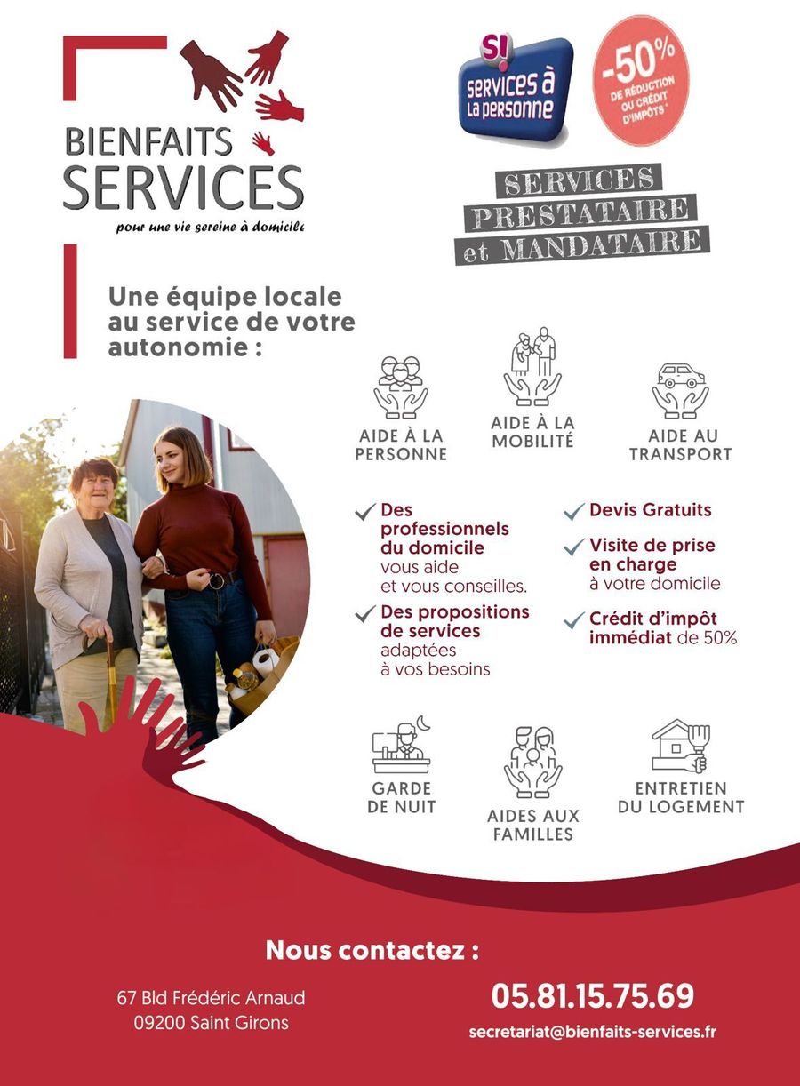 Je me permets de vous présenter Bienfaits Services, une structure d’aide et d’accompagnement à domicile implantée à Saint-Girons depuis plus de 10 ans. Nous intervenons sur l’ensemble du Couserans.